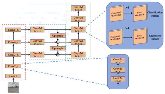 A modern CNN-based object detector is usually composed of three consecutive parts: a backbone, a neck and a head. The backbone, which is used for image feature extraction, may often be implemented via VGG [24], ResNet [25], or DenseNet [26]. The neck is used to exploit the features extracted from different stages by the backbone, normally consisting of several bottom-up paths and several top-down paths. Typical neck modules include a feature pyramid network (FPN) [27], a path aggregation network (PAN) [28], a BiFPN [29], and a NAS-FPN [30]. The head, which is used to predict the classes and bounding boxes of objects, is typically categorized into two types, namely, a one-stage detector and a two-stage detector.