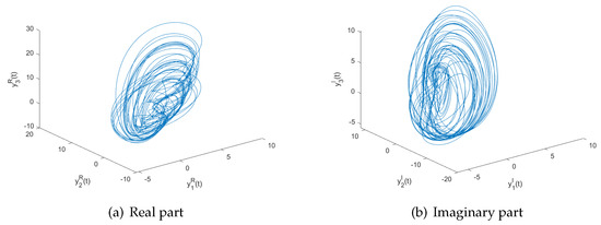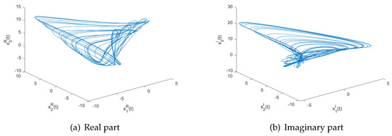 We take the initial conditions as , the corresponding state trajectories of real and imaginary parts for system (22) are shown in Figure 1a,b. From Figure 1, it is clear that system (22) is chaotic. Moreover, the states are bounded with , , , , , and .