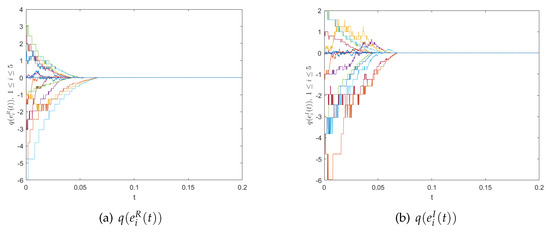 Now we embark on the fixed-time synchronization of the master–slave system (24) and (23). We take , , , , , , , , , . Moreover, we choose parameters , , , and the time-step size is 0.0001 in the simulation computation. According to Theorem 1, the fixed-time synchronization of the master–slave system (24) and (23) is reached with the controller (5), and the setting time in Figure 3. Moreover, the quantized error trajectories are also shown in Figure 4. From a numerical experiment, it can be directly observed that the numerical conclusions affirm Theorem 1.