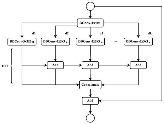 27]. When grouping reaches its extreme, where a separate convolution kernel is applied to each feature layer, grouped convolution evolves into depthwise separable convolution. The changes in the number of parameters and floating-point calculations are shown in Equations (5) and (10) in