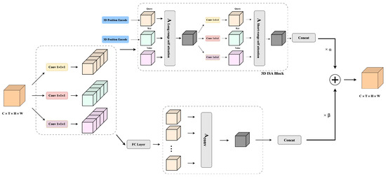 Figure 4, it is worth noting that we did not use the Unfold operation in the self-attention branch of ACMix. When we expanded ACMix to 3D convolution, we found that it occupied a large amount of memory and computational consumption on the GPU or CPU. Therefore, after obtaining Q, K, and V through the 1 × 1 × 1 convolution operation, we used the staggered sparse self-attention method to reduce the amount of computation. By sparsely connecting tokens, we first grouped the tokens and interacted between groups, and then interacted within groups to indirectly achieve the effect of a global self-attention mechanism interaction. We named our proposed module that deeply integrates convolution and attention mechanisms as ACISA. In the attention calculation branch, we use the 3D version of positional encoding to provide position information for each position of the feature map. We conducted ablation experiments on whether to use 3D positional encoding. In subsequent experiments, it can be found that using ACISA with 3D positional encoding significantly improves performance.