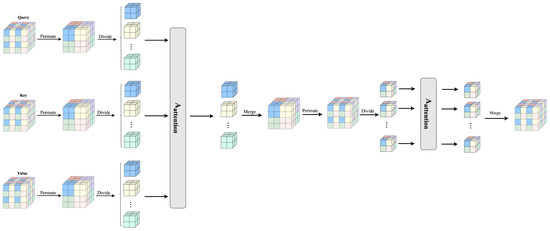 Figure 5. Firstly, we employ the permute method to systematically shuffle the 3D feature map. Then, we divide it into blocks and perform self-attention operations to capture long-range information. Subsequently, we carry out another permute operation and self-attention to capture short-range information. By continuously decomposing short-range and long-range information, we can indirectly achieve global information interaction. In contrast to ISA [