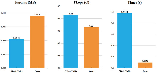 Figure 6, the number of parameters in our proposed module is slightly higher than that of the 3D-ACMix module. However, thanks to the optimization of the attention branch, the overall floating-point computation of our proposed module is less than that of the latter. In a test on a CPU with an input tensor of dimensions (1, 3, 16, 56, 56) passing through our proposed module and the 3D-ACMix module, our speed was about one-tenth that of the latter. Therefore, overall, our method is more efficient.