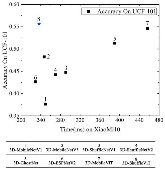 Figure 7, dilated convolution based on 3D grouping is the fastest on mobile devices, but its accuracy performance is not ideal. The closer to the upper left corner of the figure, the better the model, and it can be seen from the figure that 3D-ShuffleViT has the best balance in accuracy and speed. The large amount of memory access of 3D-MobileNetV2 also causes its inference speed to be too slow on the mobile side of devices with limited computing power compared to other models. This phenomenon is increasingly evident from GPUs and CPUs to edge devices.