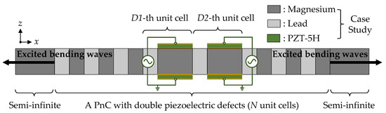 Notations bearing the subscripts ‘DU’, ‘LU’, ‘D’, ‘P’, ‘LS’, and ‘RS’ indicate the physical attributes of the dark and light gray beams within the unit cell, the defect, the piezoelectric element, and the left and right semi-infinite structures, respectively. Here, one defect and the enclosed bimorph piezoelectric elements behave as one equivalent beam, thanks to the assumption of perfect bonding. Then, the notations bearing the subscript ‘PD’ pertain to their equivalent characteristics. In detail, the subscripts ‘PD1′ and ‘PD2′ correspond to the piezoelectric defects positioned at D1-th and D2-th unit cells, respectively. The notation ‘l’ denotes the length. The unit-cell size ‘lUC’ is lDU + lLU. The overall length ‘lPnC’ of the PnC is computed as NlUnit + 2(lPD − lDU). Apart from four piezoelectric elements, the height of each beam is represented by ‘hPnC’. The notation ‘wPnC’ designates the overall width. It is noteworthy that the slenderness ratio ‘l/h’ should be the same as or exceeds ten in compliance with assumptions of the Euler–Bernoulli beam theory [35]. The notations ‘S’ and ‘I’ stand for the cross-sectional area and the second moment of area, respectively. The notations ‘ρ’ and ‘Y’ signify the mass density and Young’s modulus of the metals, respectively. The notations ‘’, and ‘e31’ for the piezoelectric elements denote the 1-axial elastic modulus and the piezoelectric coupling coefficient, respectively.