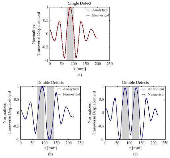 Results in defect-mode shapes: (a) the single-defect modes at 2.45 kHz (analytical approach) and 2.44 kHz (numerical approach), (b) the point-symmetric double-defect modes at 1.98 kHz (analytical approach) and 1.97 kHz (numerical approach), and (c) the line-symmetric double-defect modes at 2.84 kHz (analytical approach) and 2.81 kHz (numerical approach). The gray-shaded area presents the domain of the piezoelectric defects.