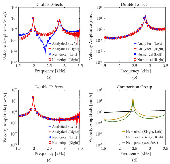 In this section, our focus turns to exploring four distinct input voltage configurations: (vPD1(ω), vPD2(ω)) = (1 V, 0 V), (1 V, 1 V), and (1 V, −1 V). Visual representations in Figure 4a–c offer a glimpse into the frequency response functions (FRFs), displaying transverse velocity amplitudes of propagating waves outside the PnC with double piezoelectric defects for each setting. In addition, the velocity–amplitude FRFs of two comparison groups are plotted in Figure 4d. The outcomes of our study firmly establish that the results emanating from our analytical approach align well with those extracted through the numerical approach. Moreover, the analytical approach delivers each figure in under 2 s, whereas the finite element method necessitates a significant time investment of 18 min. Both models share an identical frequency spacing of 10 Hz from 1.5 kHz to 3.5 kHz, yet to ensure a lucid comparative assessment, we opt to present fewer dotted plots. This underscores the remarkable prowess of the highly predictive analytical approach, significantly truncating the computational time in wave-excitation analysis.