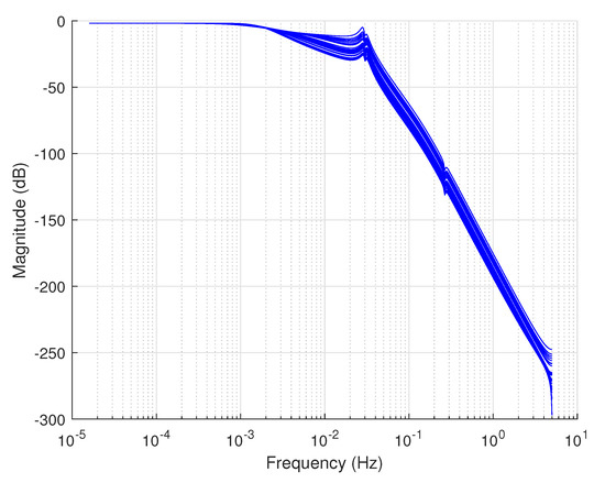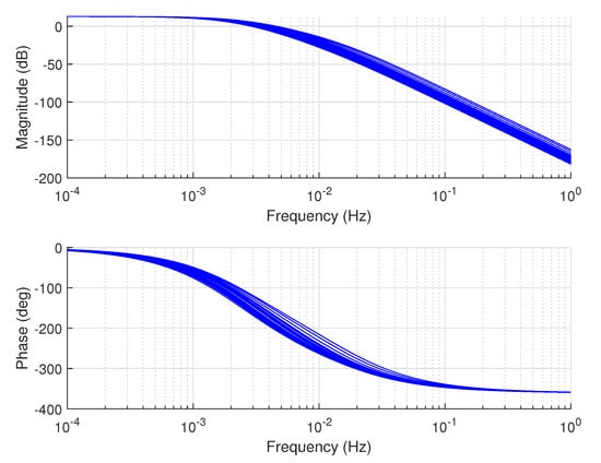 The model set M can be examined in the time and frequency domain by conducting random sampling over the range of uncertain parameter T u n c to obtain a set of representative LTI systems. The random sampling approach does not guarantee that minimal and maximal deviations of the characteristics will be captured, but since such extremes will depend on more complicated analytical examination, the random sampling approach is usually enough for practical applications. Since the linearized model (3) is valid only for a deviations from the operating point where BG levels are regulated, it can be conveniently examined in frequency domain using the Bode diagram in Figure 1.