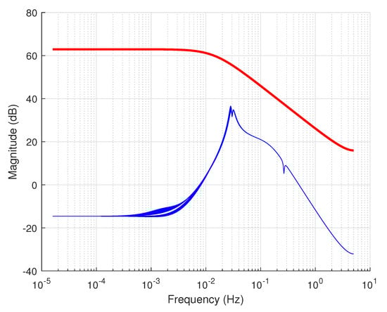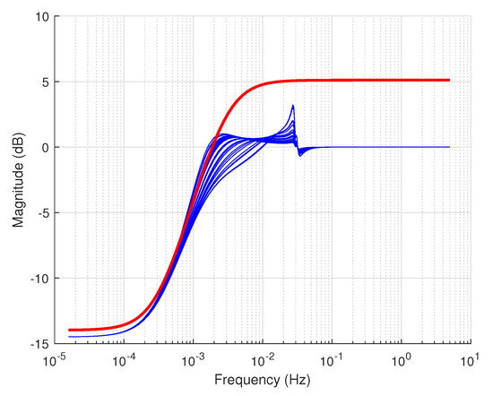 Figure 6. Output sensitivity function for the 30 samples from the uncertain closed-loop system (blue) and the inverse weighting filter 1 / W e ( j ω ) (red).