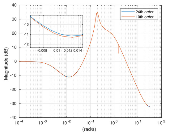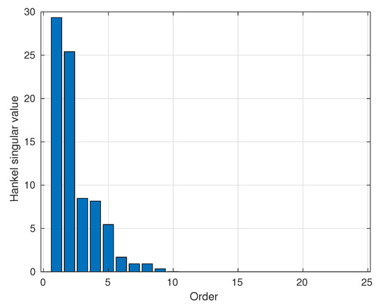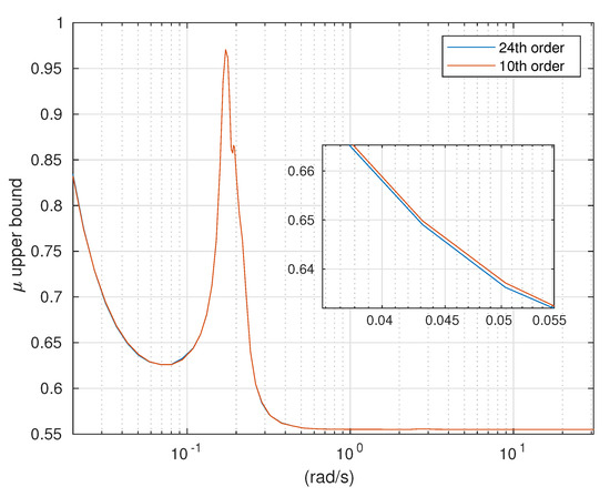 Since the controller order is 24, which might be high for implementation in digital devices, we decided to assess the possibility for its order reduction. In Figure 9 the Hankel singular values of the designed controller are shown. It is seen that the possible order of reduced controller may be selected as 10. In Figure 10, the singular values of the original and the reduced-order μ -controllers are compared. They are almost the same. Therefore, it is expected that with the reduced-order controller, the achieved closed-loop performance will be similar. Finally, we evaluated the bounds of structured singular value for robust performance of the closed-loop system (Figure 11). Both controllers provide robust performance for the prescribed range of uncertainty.