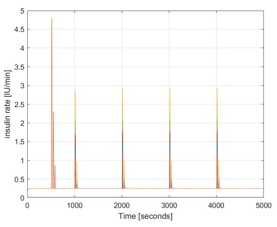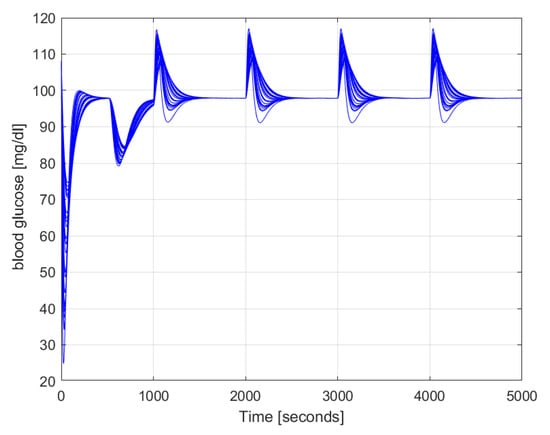 The results from the simulation are presented in Figure 12, which contains the output signal, and Figure 13, which contains the input signal. Because of the uncertain element in the model, we simulated the closed nonlinear system for 30 random samples of the uncertain element. From Figure 12, it is evident that the μ -controller ensures the robust stability and performance of the system in the presence of the parametric uncertainty. All instances of the simulation lead to successful regulation of the BG levels after the applied disturbances. Two kinds of behavior are present. In some cases, disturbance regulation is an aperiodic process, and in other cases, it is a criticalaperiodic process. The worst-case deviation into the hypoglycemic region is above 90.