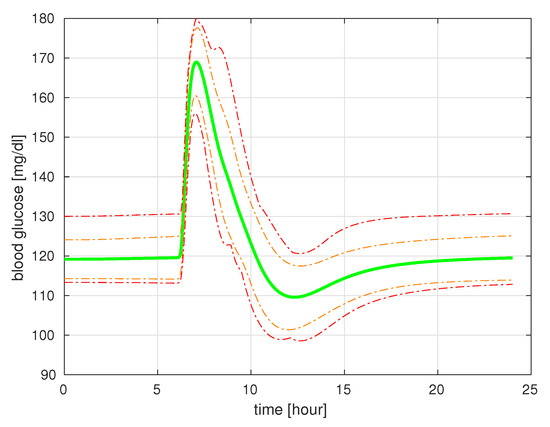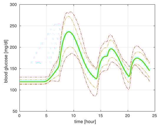 Figure 18. Glucose trace for the 10-adult population from the UVA/Padova simulator for 24 h scenario. The green line represents the average glucose, the orange line represents the ± 1 standard deviation interval, and the red line is the minimal and maximal values from the envelope.