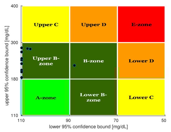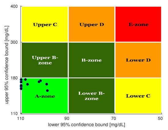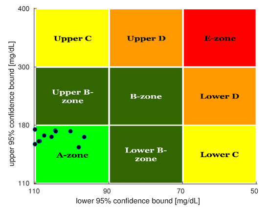 Figure 16 presents the control-variability grid analysis (CVGA) per subject of the simulated adult population. The CVGA is a powerful tool that is well accepted by AP engineers for judging the outcomes of a simulation. We see that all subjects with the μ -controller fall into the green A-zone and bordering with the upper B-zone, but not intersecting into it. Figure 17 shows the CVGA when the Padova simulator is run with the reduced-order controller from the 10th order. It is seen that the result is again satisfactory, which justifies the controller order reduction. Thus, for practical implementation, we can use a simpler μ -controller of the 10th order.
