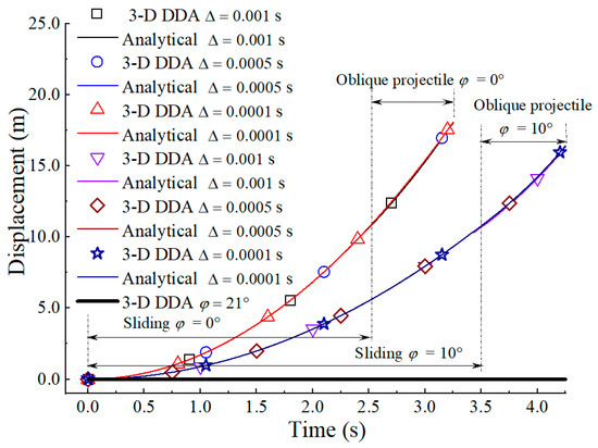 Three friction angle values, φ = 0°, 10°, and 21°, were studied under three different time step sizes, e.g., Δ = 0.0001 s, 0.0005 s, and 0.001 s. The comparisons of the displacements of sliding and oblique projectile motion between the 3D DDA results and the analytical solutions ((19) and (20)) are shown in Figure 5. It can be seen that the 3D DDA results were stable under the three different time step sizes and showed a highly satisfactory agreement with the time-dependent displacement functions predicted by the analytical solutions. The correctness of the freefalling simulation was also verified by oblique projectile motion indirectly, since the cube is only affected by gravity in the process of oblique projectile motion.