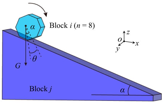 As shown in Figure 6, assume a rolling block i on a fixed block j with a slope angle of α, and the friction angle φ is larger than α to ensure block i is at rest while no rolling occurs. The block system is only affected by gravity. The CRIA θ is half of the corresponding central angle for one edge of an equilateral polygon with n edges. For block i in Figure 6, n = 8 and α = 22.5°.