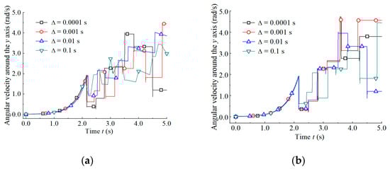 To illustrate the superiority of the CITI scheme relative to the CAI scheme in the rolling simulation of 3D DDA, four time step sizes, Δ = 0.0001 s, 0.001 s, 0.01 s, and 0.1 s, were studied. Figure 8 shows the rolling angular velocity–time response of block i around the y axis under different time integration schemes and different time step sizes. As can be seen from Figure 8a, the changing law curves of the rolling angular velocities are disordered, and when Δ = 0.01 s and 0.1 s, the angular velocities are variable, but not constant within one stage, which should have been smooth and steady. Figure 8b shows good performance in the changing law of the rolling angular velocities. The results of the CITI scheme were more stable and precise than the CAI scheme in terms of large time step size cases.