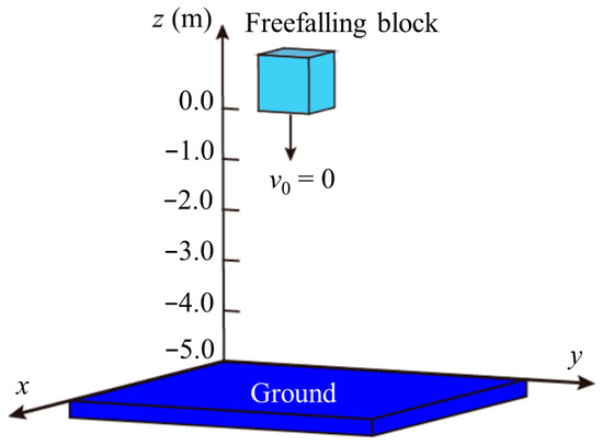The 3D DDA bouncing model is shown in Figure 9. A single block undergoes freefalling from a height of 5.0 m from the ground and collides with the ground repeatedly. First, the splitting parameter was assumed to be δ = 0.5. The bouncing displacement of the freefalling block was recorded up to 10.0 s, and the time-dependent displacement curves calculated by the CAI scheme and CITI scheme are plotted in Figure 10. The bouncing process of the freefalling block with the two schemes is summarized and discussed as follows:
