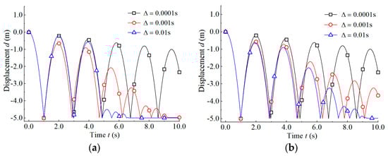 - When a small time step size (e.g., Δ = 0.0001 s) was adopted, the calculation results of the two schemes were similar, and the corresponding bouncing displacements were rarely dissipated with the collision with the ground, whose change trends were basically consistent. When a large time step size (e.g., Δ = 0.001 s) was adopted, the bouncing displacement was completely dissipated to rest at about 8.9 s with the CAI scheme, whereas with the CITI scheme, the bouncing displacement was slowly dissipated and there was still large bouncing displacement until 10.0 s.