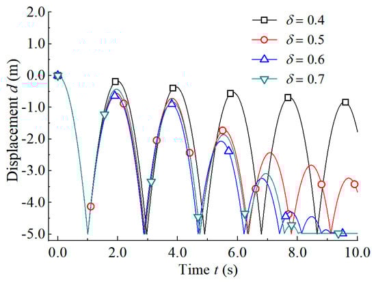 To explore the influence of the sub-step sizes (i.e., δΔ and (1 − δ)Δ) on the energy dissipation of the bouncing block, four splitting parameters, δ = 0.4, 0.5, 0.6, and 0.7, were studied under time step size Δ = 0.001 s, and the corresponding bouncing displacement–time curves are shown in Figure 11. The larger the splitting parameter was, the faster the bouncing displacement decayed, and the more significant the dissipated energy. For a small splitting parameter (e.g., δ = 0.4), the bouncing displacement decay was subtle; for a large splitting parameter (e.g., δ = 0.6 or δ = 0.7), the bouncing displacement decay was obvious; for δ = 0.5, the bouncing displacement decay was gradual. The recommended splitting parameter δ = 0.5 by Bathe and Baig [33] is efficient for the 3D DDA calculation. It can be seen that the splitting parameter had an influence on algorithm damping, i.e., the larger the splitting parameter, the greater the algorithm damping was.