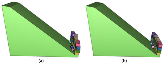 The final states of the collisions between the three blocks and the protective wall under different integration schemes are shown Figure 13, and Table 1 lists the corresponding time to ultimate stability. The final states obtained by the CAI scheme (Figure 13a) were more destructive than those by the CITI scheme (Figure 13b), which is conservative. The stabilizing time of the CITI scheme (δ = 0.5) was slower than that of the CAI scheme, and thus, the damping of the CAI scheme was larger in this case. For the CITI scheme, with the increase of splitting parameter δ, the stabilizing time of the rolling blocks tended to be faster and faster, and thus, the damping increased as the splitting parameter δ increased. Remarkably, the calculation efficiency of the CITI scheme became lower than that of the CAI scheme in the case of many rolling blocks being involved. The probable reason is that the time step of the CITI scheme is divided into two steps. The CITI scheme was also generalized to n sub-steps by Bathe and Baig [33]; the trapezoidal rule can be applied n − 1 times, and the solution can be obtained at the end of the time step by an (n + 1)-point backward difference scheme. Although the n-sub-step CITI scheme is theoretically available in DDA, the computational efficiency may be significantly decreased.