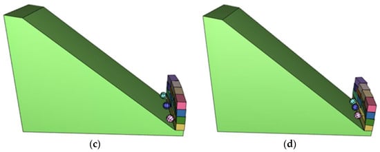 Three static rolling blocks roll along an inclined plane with a slope angle of α = 40° and collide with a protective wall composed of 14 blocks. The details of the 3D DDA model are shown in Figure 12. The rolling blocks are the same approximate spheres; the number of both their longitudinal and latitudinal segments is six, the approximate radii are rb = 0.5 m, and their unit mass was assumed to be 2.5 kg/m3. The 3D DDA calculation parameters were as follows: time step size Δ = 0.00001 s; cohesion c = 0; friction angle φ = 30°; the normal and shear spring stiffnesses are 105 kN/m and 104 kN/m, respectively.