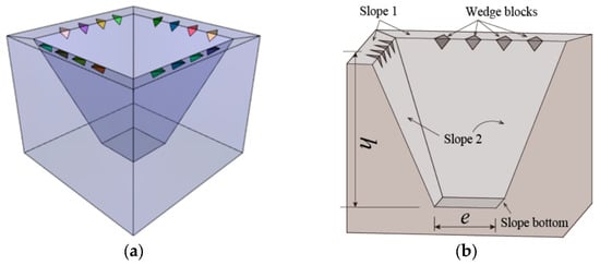 The 3D DDA ideal model of an open pit undergoing wedge failure. (a) The 3D DDA model; (b) half of the wedge failure model.
