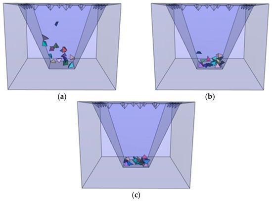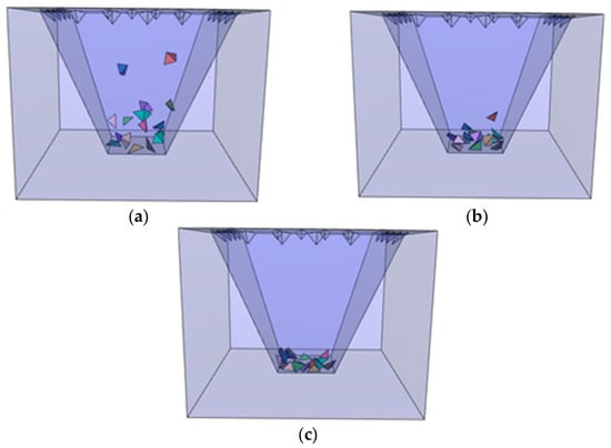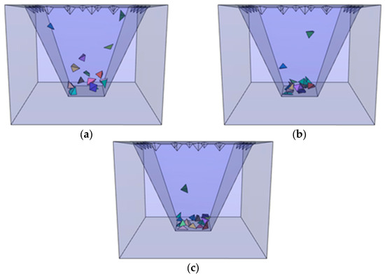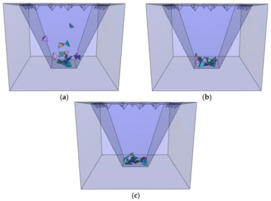 Movement process of wedge blocks by the CITI scheme (δ = 0.6). (a) t = 10.0 s, (b) t = 15.0 s, and (c) t = 20.0 s.