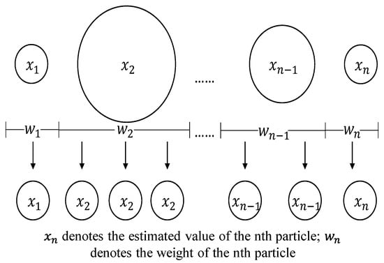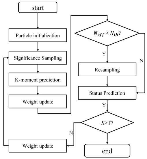 - Importance sampling and weights calculation: at the moment k > 0, according to , the particle weights can be updated as , where , and the weights are normalized .