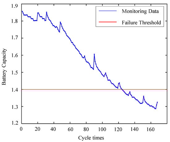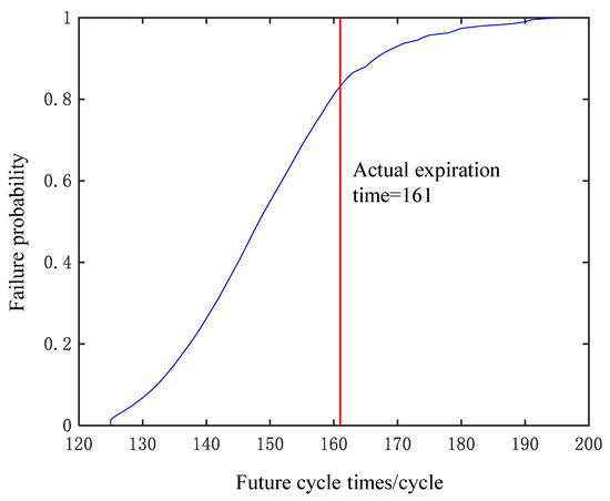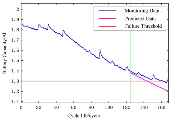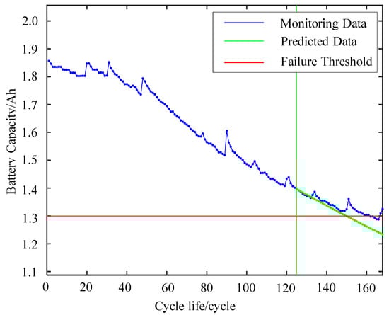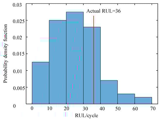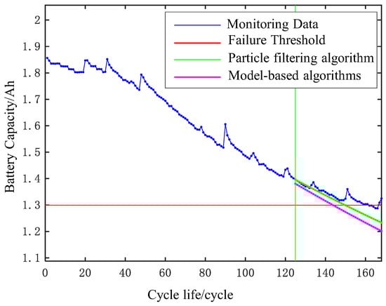 - From Equation (9), the battery RUL is the number of cycles from the current number of cycles to the first time the battery reaches its life threshold, assuming a life threshold of 0.72 Ah; then, we calculate the estimate of the RUL of the ith particle at the th cycle:
