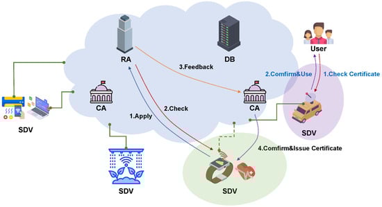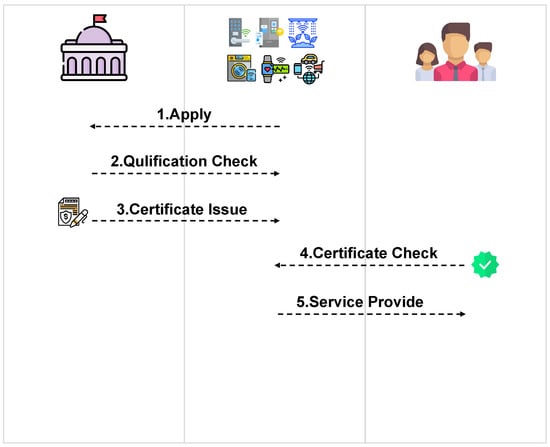 With the advent of the 6G era, the Internet of Things (IoT) has been applied in diverse fields, such as healthcare, agriculture, smart homes, etc., connecting large numbers of devices like mobile phones, wearables and even household appliances [1,2]. In this context, it is vital to ensure the validity of accessing devices. Most existing IoT authentication schemes depend on certificates in the public key infrastructure (PKI) system [3,4], which mainly consists of three components: a certification authority (CA), a registration authority (RA), and a database (DB). In this system, the RA functions as the verifier of the devices’ identities, the CA is responsible for the issue of certificates for valid devices, and the DB acts as a manager to save additional items about certificates.