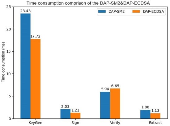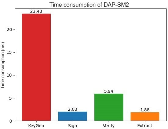 Here, we mainly focus on the time consumption of the four sub-algorithms, KeyGen, Sign, Verify and Extract. The experimental data show that the time consumption of these are 23.43 ms, 2.03 ms, 5.94 ms and 1.88 ms, respectively. We illustrate the results in Figure 4. Here, we set the size of the address space as 10.