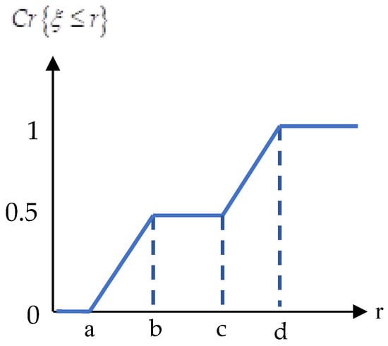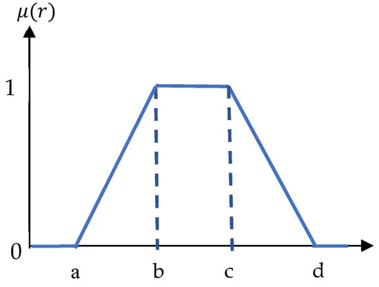 Let be a trapezoidal fuzzy variable with a membership function provided by Equation (7) (see Figure 3), and let be a fuzzy event with a credibility determined by Equation (8):