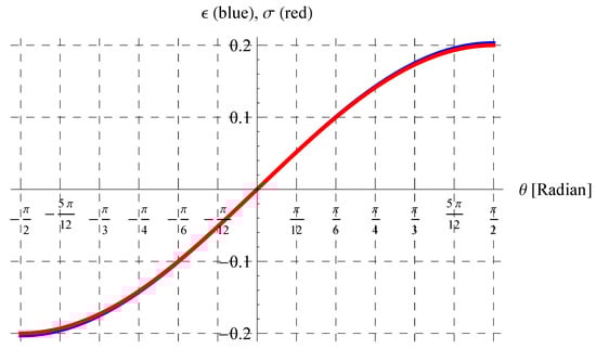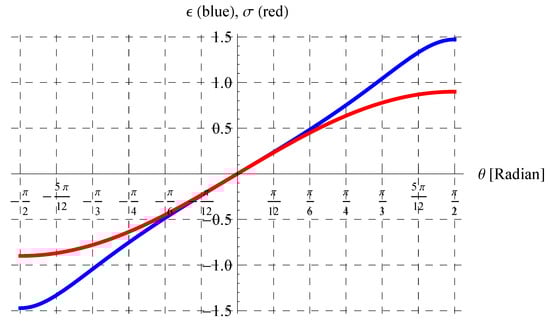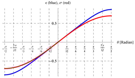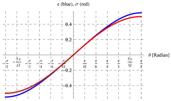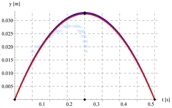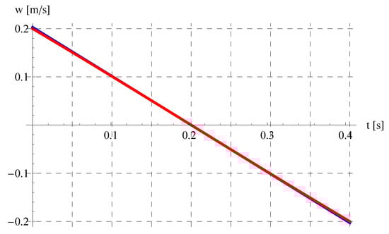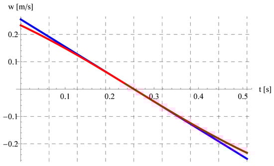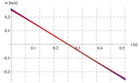 The analytical solution of this equation is not available; hence, an explicit formula for w in terms of t is a challenge. Such a difficulty can be overcome by searching for an accurate analytic approximation of in terms of w, as demonstrated below. Let and , where is the angle of the instantaneous velocity v with the horizontal axes x at a moment t. Figure 1, Figure 2, Figure 3 and Figure 4 show the curves of and at different values of v in the domain . These figures indicate that the curves of and are nearly identical for when (Figure 1), when (Figure 2), when (Figure 3), and (complete domain) when (Figure 4). Therefore, the approximation can be applied, taking into account the above considerations. The validation of such an approach will be extensively addressed in the discussion section. Accordingly, Equation (20) becomes