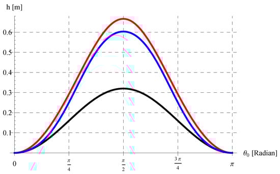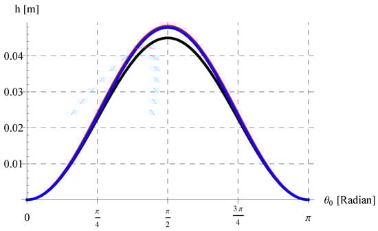 In Figure 13 and Figure 14, the maximum height h (in units of ) is depicted/compared with the corresponding results of the RP in Ref. [] and the NRP at (Figure 13) and (Figure 14). In all cases, the h is symmetric about (radian) as expected, but both our curve (blue) and the curve (red) of Ref. [] for the RP are appreciably greater than that of the NRP. However, our curve is lower than the corresponding one of Ref. [], especially at higher such as in Figure 13. Reasons for such behavior are explained here. Since the instantaneous mass of the RP decreases with motion in the present study, it is always less than the mass in Ref. []), which was taken as a constant during motion. It was theoretically proved that (see Section 5.6) and confirmed through Figure 15, Figure 16, Figure 17 and Figure 18.