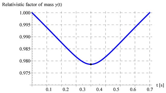 In the literature, the projectile problem (PP) has been extensively discussed in text books [,]. Further, it was investigated in Newtonian mechanics using classical calculus [,,,,,] and also in view of fractional calculus [,,,,]. However, the above studies considered the PP when the initial velocity of the projectile is small when compared to the speed of light c. In such studies, the initial (rest) mass of the projectile remains constant during the motion. However, the situation is different when the velocity of the projectile becomes a considerable value compared to c, such as or . In this case, the relativistic mass m should be taken into account according to the SR. This means that m is not constant after launching the projectile and so, the non-relativistic mechanics (Newtonian mechanics) is no longer valid to treat the PP with velocities comparable to c. Also, the Earth’s gravitational force acting on the projectile changes due to the change in mass. These points were not addressed in Refs. [,], in which the Earth’s gravitational force was taken as a constant during the motion. The discussion above motivated us to reconsider the PP, taking into account the Lorentz relativistic factor . The equations of motion will be formulated for the relativistic projectile (RP) utilizing the Newtonian second law of motion in relativistic form. It may be important here to point out that the authors in Refs. [,,] formulated the equations of motion of the RP and pendula utilizing the relativistic form of the Newtonian second law of motion.