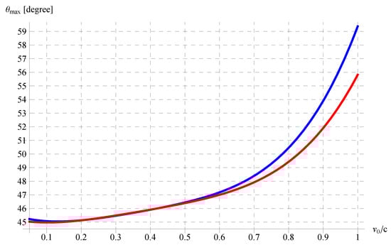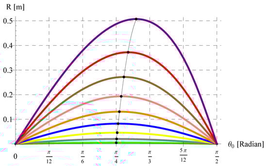 Figure 19 indicates the variation of R against at different values of . It can be seen that R is not symmetric, especially at relatively higher values of . The symmetry happens in the first two curves from below, i.e., at (green) and (gray). Above these two curves, the symmetry disappears. In addition, R is maximum when for (green) and (gray). For the rest of the curves, R is maximum at different values of in the interval . It can be concluded from this figure that the angle that maximizes the range R depends on such that when while approaches as approaches c. Such dependence of on is depicted in Figure 20. This figure confirms our results above that .