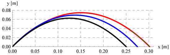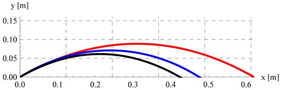 Comparison between the present trajectory (blue), the corresponding results in Ref. [] (red), and the non-relativistic trajectory (black) are presented in Figure 21 and Figure 22 at , (Figure 21) and , (Figure 22). These figures reveal that the current trajectory (blue) is shows much more curvature than the corresponding one in Ref. [] (red) for the RP. This is because of the same reasons explained before when discussing the results of the maximum height h in Figure 13 and Figure 14.