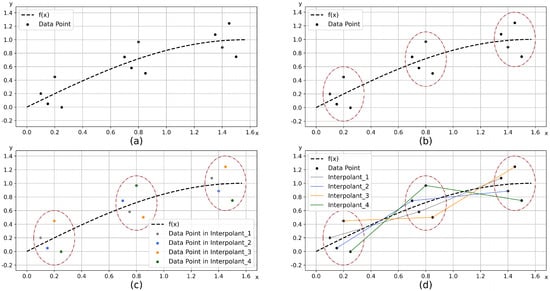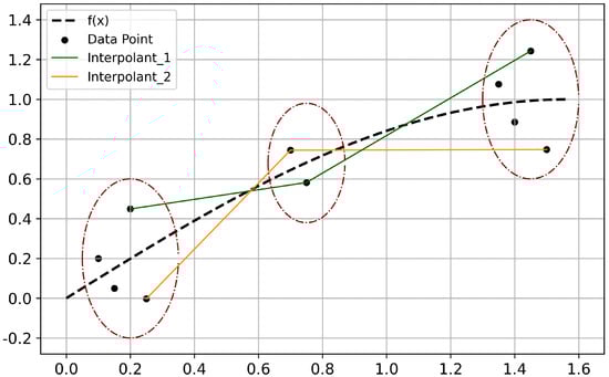 Traditional interpolation methods are based on the function values of known data points for extrapolation and prediction. For a given dataset, there are generally two cases. In the case of two known data points and interpolation in between, the interpolation method can be selected based on distance, such as in nearest neighbor interpolation [14]. If it is assumed that the unknown point between these two data points is consistent with the straight line between them, a linear function, such as linear interpolation or piecewise linear interpolation [15,16], can be used to fit and interpolate. For interpolation among multiple given points, a commonly used method is to predict the value of the unknown point by constructing a high-degree polynomial based on the given points, such as is performed with Lagrange interpolation or Newton interpolation [17,18]. However, with an increase in the number of data points and the degree of the polynomial, there is a risk of overfitting and numerical instability (Runge’s phenomenon) [19]. Another solution is to construct a global smooth function by fitting a low-degree polynomial in a local region. In comparison to high-degree polynomial interpolation methods, this method has better smoothness and numerical stability, such as is seen in spline interpolation [20]. Nevertheless, as it is necessary to fit multiple local low-degree polynomials, this method can lead to relatively high computational complexity.