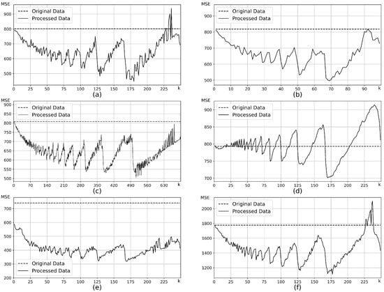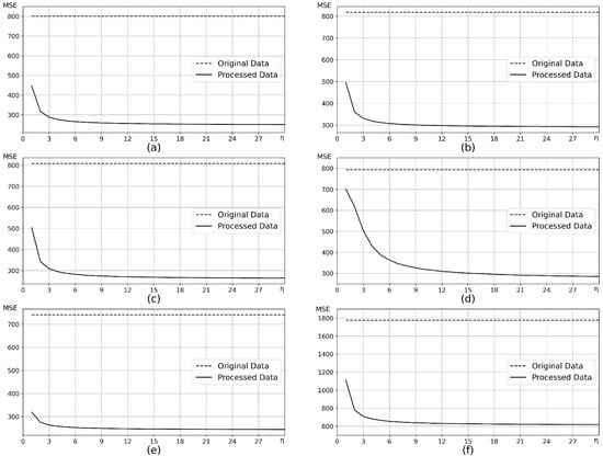 First, we investigated the determination of parameter k. To ensure that the number of feature subspaces was sufficient, we set the hyperparameter , letting . To calculate the changes in the MSE of the datasets at different values of k, we obtained . The change trend in the MSE index before and after the ASISO processing is shown in Figure 4. Then, by letting , we calculated the changes in the MSE of the datasets (Figure 5), and obtained . At last, we let , and , and we calculated the changes in of the simulated datasets (Figure 6).