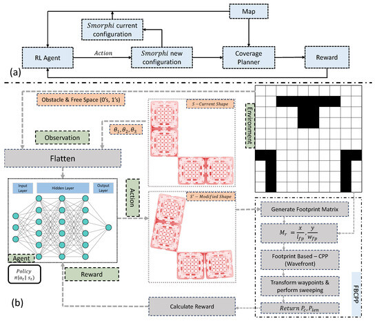 Reinforcement learning (RL) has been studied in reconfigurable robots due to their simplicity and adaptability. For example, in [34], the authors introduce a deep RL approach for the hardware design of a reconfigurable legged robot. This approach identified the best crawling motion for the robot in a given environment by modifying its structure. Similarly, in [35], the authors present an RL-based approach for a staircase-climbing robot. The robot learned to safely climb staircases of different sizes using this approach. Additionally, the authors present a unified approach for locomotion and manipulation in a reconfigurable robotics limb using RL in [36]. This approach allows the skills to be shared between manipulation and locomotion. The RL approach has also been widely adopted for area coverage tasks in reconfigurable robots. For instance, in [37], the author presents strategies to overcome obstacles optimally in a reconfigurable robot named RSTAR using Q-learning. Energy-aware complete coverage for a reconfigurable robot named hrombo is reported in [38]. The author identified the optimal trajectories to cover the given map using RL by modeling the problem as the traveling salesman problem (TSP). Similarly, in [39], the author use the LSTM with the actor–critic experience replay (ACER) RL algorithm to generate optimal trajectories to cover the given environment. Similarly, a few coverage approaches using RL have been explored in reconfigurable robots [40,41]. However, all the RL-based approaches that have been studied in self-reconfigurable robots have primarily reported on identifying optimal trajectories for a set of configurations. Moreover, the exiting approaches did not focused on finding the optimal morphology for a given map that maximizes area coverage and minimizes energy consumption which is the focus of the present work.