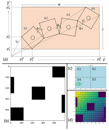 (a) Footprint modelling of the robot with the four blocks (B1–B4) with the relative angles labelled as The footprint dimensions denoted as l and w, (b) Initial Map, (c) Smorphi’s footprint configuration with the (), and (d) resized map based on the footprint with the implemented complete coverage planning.
