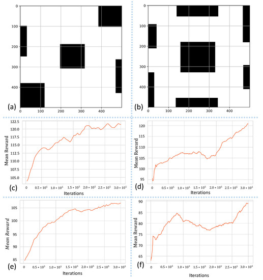 Representation of simulation Map-I (a) and Map-II (b). Observed mean reward vs. number of iterations for PPO and A3C on Map-I (c,d) and on Map-II (e,f).