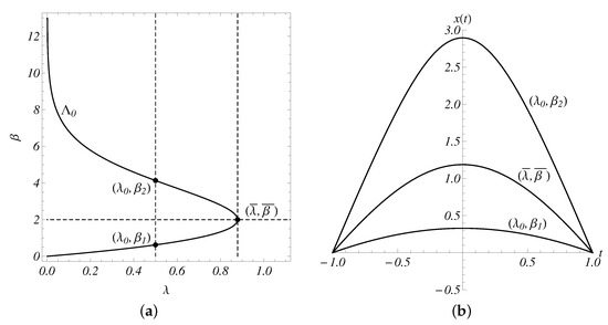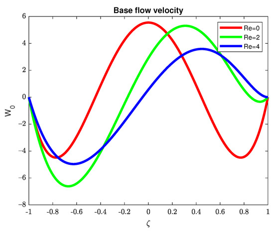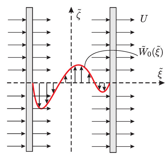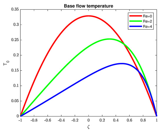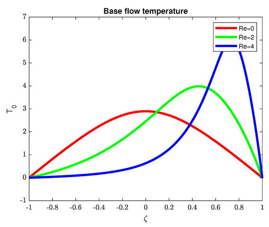 In practice, the base flow considered in the paper takes place in the middle portion of a sufficiently high vertical channel with a large aspect ratio. One can observe that (a) nonlinearity appears only in Equation (8) and (b) the boundary value problem for can be solved separately. If would be known, then one can determine from (7) and (9). In addition, constant is determined from (10). In a classical hydrodynamic stability theory, the base flow is usually determined as an exact solution of the equations of motion. Different approaches are used in the literature to construct exact solutions (see, for example, Refs. [37,38] for the case of isothermal flows and [39] for convective flows). Since a closed form solution to (8) and (9) is not available, problem (7)–(10) has to be solved numerically. Thus, the properties of the boundary value problem (7)–(10) such as the existence and multiplicity of solutions are determined by the boundary value problem for the function . Different mathematical tools are used in the literature to prove the existence of solutions (see, for example, Ref. [40] for incompressible Navier–Stokes equations). Rigorous mathematical analysis of these properties is the subject of investigation in the next subsection.