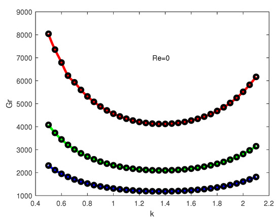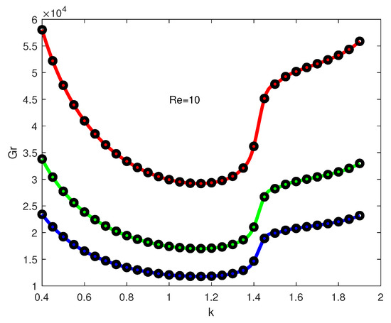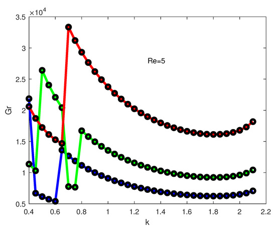 Critical values of the Grashof number versus are shown in Figure 12 for three values of . It is seen from the graph that the critical values can be divided into three regions: (1) a region of stabilization (), where is approximately equal to 4.791, 4.630 and 4.688 for the values of and 0.7, respectively; (2) a small region (around ), where the increase in leads to destabilization of the flow; and (3) , where the flow is stabilized again. Note that stabilization is stronger for smaller .