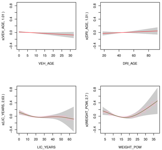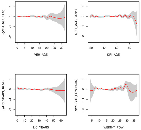 As for the Gamma regressions, it appears that there is a certain overfitting, both for the default value of k () and the rest of the values used (, 20, 30, and 50). This can be seen in Figure 1, that depicts the values taken by the splines of the continuous rating factors for the Gamma regressions with a value of (the red lines, with a 95% confidence band in grey around them). In this figure, there is a series of oscillations in the splines that do not reflect any foreseeable effect of the explanatory variables, but are a mere consequence of a too-high value for the degrees of freedom allowed in the splines.