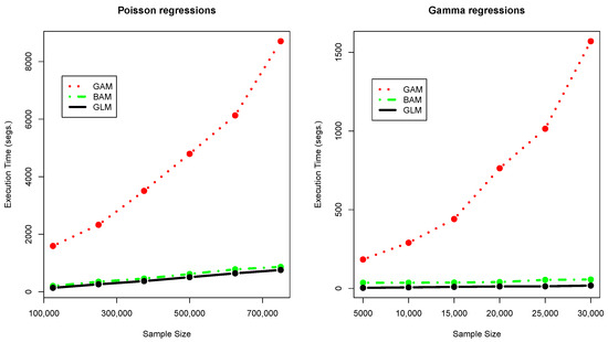 With regard to execution times, the greater complexity of the GAMs implies longer execution times compared to the GLMs. According to Table 3, in the case of the Poisson regressions, these times were, on average, approximately ten times higher for the GAMs than for the GLMs and about 61 times higher in the case of the Gamma regressions. These differences in the execution times are large enough to pose a serious problem when working with big samples and tilt the balance in favor of the less demanding GLMs. Nevertheless, these differences almost vanish if the bam function of the same R package (mgcv) is used instead of the gam (especially for the Poisson regressions). The bam function was designed to deal with big datasets, and its results were very similar to those obtained with the gam function but with a dramatic reduction in execution times. Also, this function can be executed in parallel in a cluster with multiple CPUs, speeding up the calculations and providing additional reductions in execution times. Table 3 shows that the execution times of the bam function were very similar and of the same order of magnitude as those of the gam function in the case of the Poisson regressions, and only about five times greater (instead of 61 times if the bam function was not used) for the Gamma regressions. Thus, GAMs estimated using the bam function are a competitive alternative to GLMs.