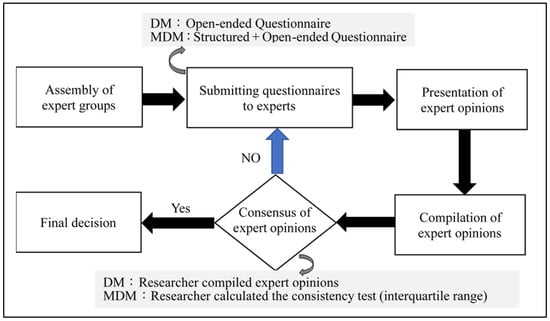 Lin and Cho [36] argue that the DM has the following limitations: (1) The findings of the DM are susceptible to interference by subjective judgments of experts. (2) The process of implementing the DM is susceptible to the influence of the questionnaire distributor. (3) The DM is a time-consuming and labor-intensive process that is difficult to control. The MDM is an improved version of the traditional DM designed to reach expert consensus more efficiently. Compared with the traditional DM, the MDM has significant innovations with respect to the following points: (1) Diversified selection of experts: The MDM emphasizes a clear definition of the objectives and scope of the study and ensures that the experts selected have the knowledge and experience in the relevant fields. Moreover, the MDM advocates the participation of experts from multiple fields and backgrounds, covering a wide range of fields, such as academia, industry, and government sectors, in order to obtain more comprehensive and specialized opinions, thus enhancing the reliability of the consensus [36]. (2) The use of structured questionnaires: The MDM introduces structured questionnaires as an alternative to the traditional open-ended questionnaires. This type of questionnaire is designed to make the questions and options clearer, and the experts are able to express their views more precisely. The usefulness of structured questionnaires not only improves the effectiveness of expert responses but also helps to speed up the process of questionnaire collection and data analysis [37]. (3) The optimization mechanism of round-by-round surveys: The MDM also employs multiple rounds of surveys, but the goal is to progressively optimize expert opinions to reach consensus or near consensus. At the end of each round, the researcher assesses the consistency of expert opinions using methods such as interquartile deviation [37]. By analyzing these indicators, differences in opinion can be identified more efficiently, and targeted adjustments can be made, leading to a gradual convergence of expert opinions. (4) Efficient achievement of consistent results: The MDM interquartile assessment methodology plays an important role in achieving consistency of expert opinions. By identifying the variations and differences in the distribution of opinions, researchers can more accurately measure the degree of consistency of expert opinions. Such quantitative indicators help to quickly determine the formation of expert consensus and thus finalize the opinion more quickly [37]. This study organized the main implementation processes and differences between the DM and MDM, as shown in Figure 3.
