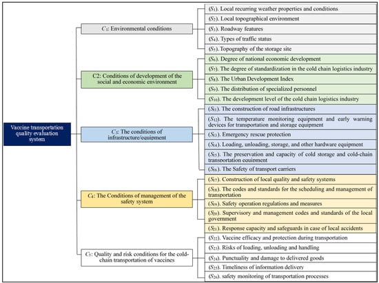 In this phase, the literature collection was the main focus, and the technical standards of the government and international organizations on transport quality and safety, vaccine transport, cold-chain transport, and other related literature were compiled and summarized. In total, 6 primary indicators, 29 secondary indicators, and 173 tertiary indicators were determined. After three rounds of screening, the COVID-19 vaccine transport quality and safety indicators were finalized into 5 primary indicators (criteria) and 26 secondary indicators (sub-criteria). The indicator system is shown in Figure 4, and the definitions of the sub-criteria are described below.