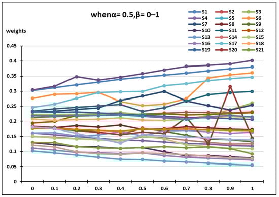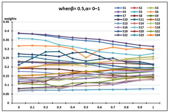 With and , when the environment is the most stable in the future (), the first five evaluation criteria are vaccine efficacy and protection during transportation (S22), local recurring weather properties and conditions (S1), construction of local quality and safety systems (S17), degree of national economic development (S6), and degree of standardization in the cold-chain logistics industry (S7). With an increasingly unstable future environment, the weight of the top five ranked indicators gradually drops as the environment stabilizes, and the lower-ranked indicators gradually rise. Among those with steadily increasing weights are the safety monitoring of transportation processes (S26), response capacity and safeguards in case of local accidents (S21), types of traffic status (S4), distribution of specialized personnel (S9), and rate of timeliness of information delivery (S25). This suggests that the safety monitoring of transportation, emergency response capabilities, traffic status, cold-chain talent, and information delivery become increasingly important as the uncertainties of future environments become elevated.