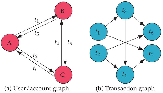 Figure 1. Money laundering through financial and blockchain transactions. - The GCNs suffer from an over-smoothing problem, since transaction graphs have vast numbers of nodes, further reducing the accuracy of the detection results. When the user/account graph is converted to the transaction graph, the original transaction edges become nodes. For example, , the first transaction, transfers funds to account B in Figure 1a. Subsequently, account B initiates two transactions, and . Therefore, in Figure 1b, points to both and . We observe that the transaction graph often has more nodes than the user/account graph. This is because, due to frequent transactions between accounts, the number of nodes in the account graph remains constant while the number of nodes in the transaction graph increases. For example, Figure 1a has only three nodes, but when converted to Figure 1a, there are six. In the GCNs, node A only needs to aggregate the information of two nodes (B and C), and node needs to aggregate the data of four nodes (, , , and ). Moreover, if the nodes in Figure 1a make more complex transactions, the nodes in Figure 1b are more numerous and require deeper GCNs to capture the complete information. These will speed up the over-smoothing.
